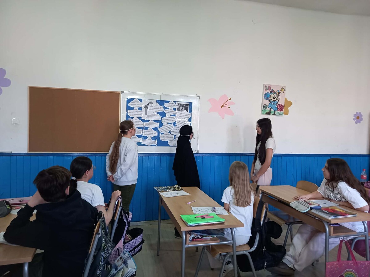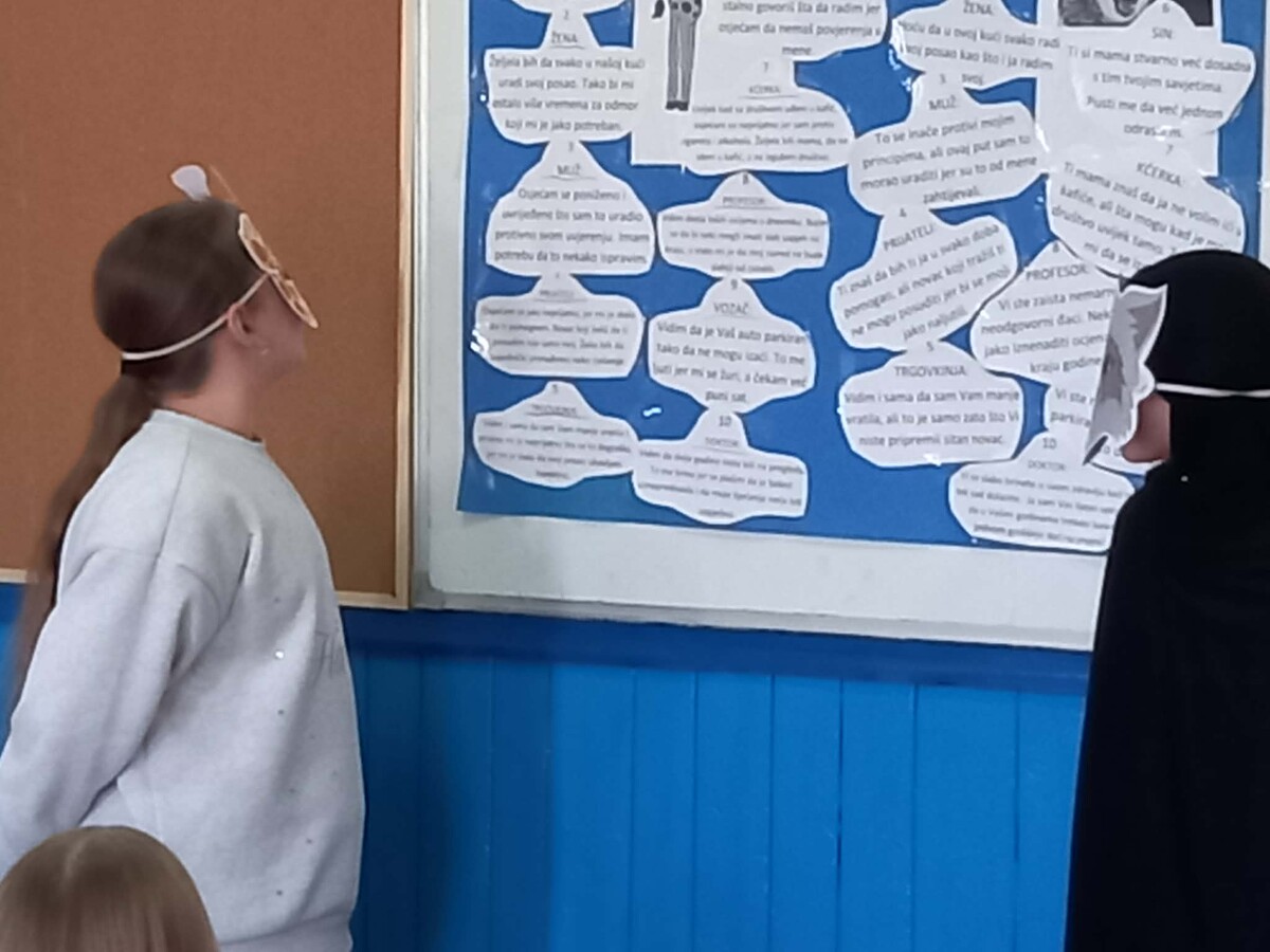 Učenici 6b odjeljenja, zajedno sa nastavnicom Dedić Eminom, su na času odjeljenske zajednice učili nenasilnu komunikaciju, čiji je cilj usvajanje vještina za iskreno izražavanje i empatijsko slušanje, bez osuđivanja. U literaturi nenasilna komunikacija se spominje kao govor žirafe, gdje učimo kako izraziti svoje emocije i potrebe bez napadanja i okrivljivanja drugih. Žirafa govori “govorom prihvatanja”, razgovara o vlastitim emocijama i potrebama, poštuje želje i potrebe drugih ljudi. Vuk koristi “govor odbijanja”, napada, vrijeđa i ne cijeni drugu osobu, uvijek okrivljuje druge. “Svi su drugi krivi, samo ja ne”, kaže osoba pod maskom vuka.